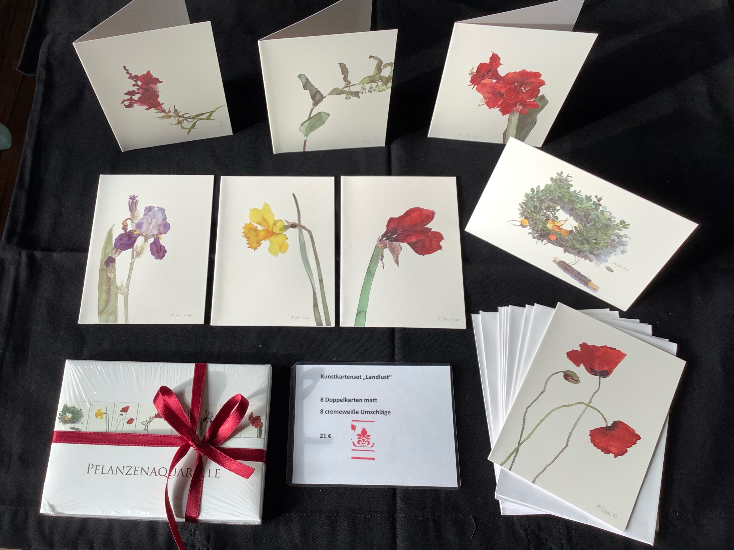 Set I: „Pflanzenaquarelle" (8 Karten C6 hochglanz kaschiert, 8 Umschläge in Farben sortiert) für 18 €